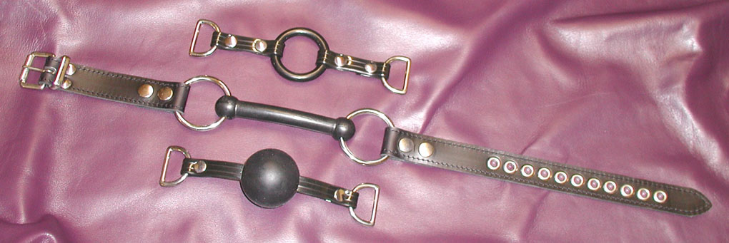 Made to order, this is an extremely versatile leather mouth gag, offering the use the three most popular gags on the market. The set comprises of a pony bit, a ball gag and a ring gag. There is a choice of diameter and colour for both the ball and ring gags. The ball gag is made exclusively for us from FDA approved food grade silicone, ensuring it is non toxic with no nasty taste or smell. The pony bit and ring gag are both made from nylon. The strap is 1" wide and made from stitched high quality leather which has been lined with our unique waterproof leather making it easy to keep clean with a damp cloth. The gags are inter-changeable via two press studs at either side, making the most of these three popular gags, which can be changed in seconds for great BDSM play.