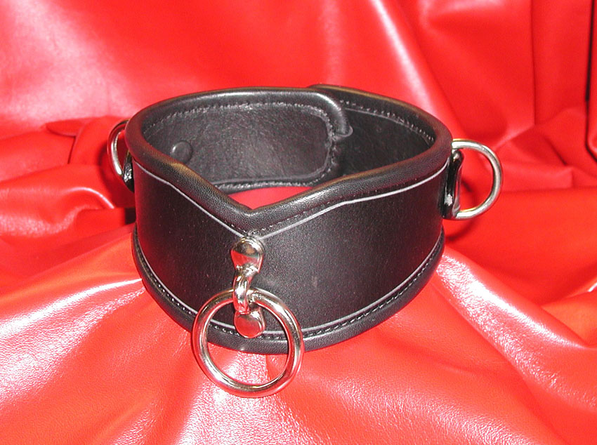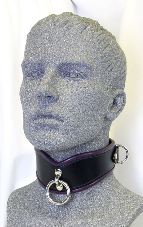 Made to order this stylish leather bondage collar is manufactured from saddle leather, with full leather lining. It has one O-ring on the front, and two D-rings on the side for attachment. With the edges bound in lambskin making it extremely comfortable to wear for long periods of time. Available with either a locking or traditional buckle and a choice of trim colour.