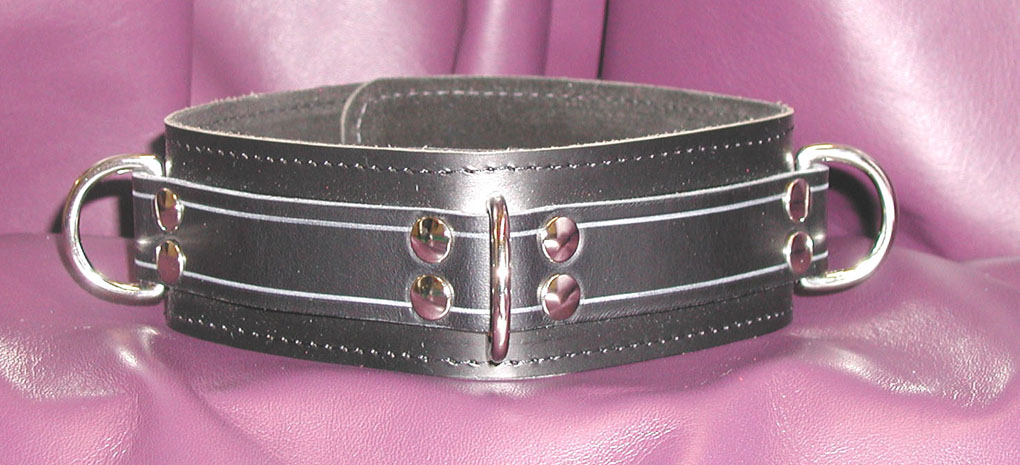 Made to order, this leather bondage collar is manufactured using only the highest quality materials. For strength and durability it is both stitched and riveted and has a soft black suede lining for comfort. There are three solid cast D-rings conveniently positioned for attaching a lead or securing down. This collar is close fitting and 2 inch / 50mm wide and is fully adjustable. To compliment this bondage collar there are leather wrist cuffs, leather ankle cuffs and leather thigh cuffs available.