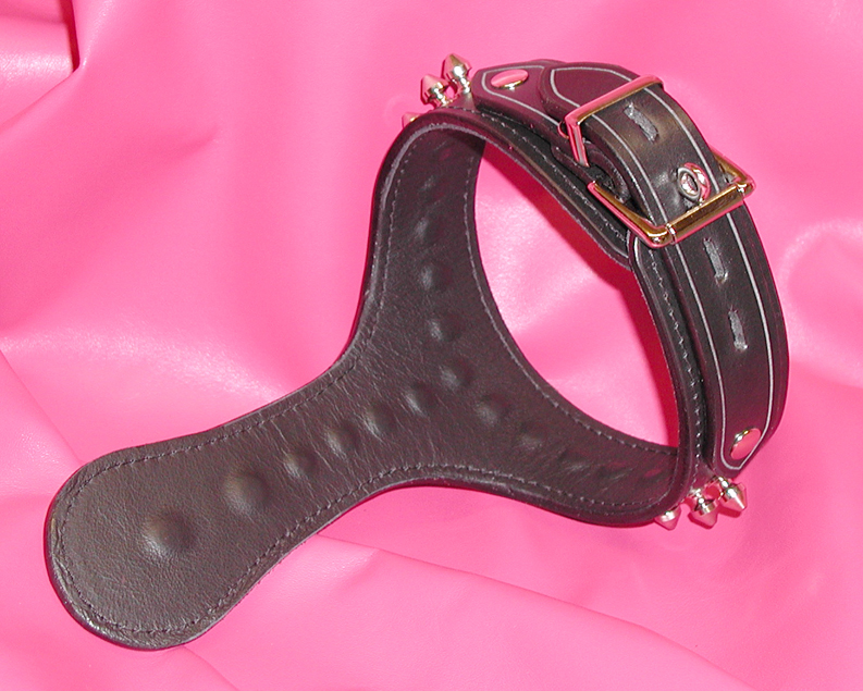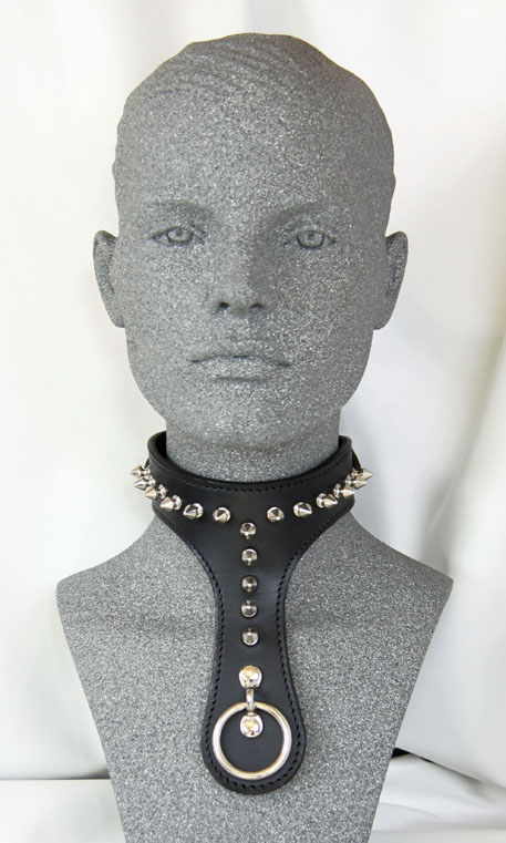 Made to order our traditionally styled "O" collar, fully leather lined and contoured to fit around the neck. Stylishly designed with small spikes, a 1¼" / 32mm O-ring on the front and available with a traditional or locking buckle on the back. The drop from the top of the collar to the base of the "O" is 6.5" / 165mm.