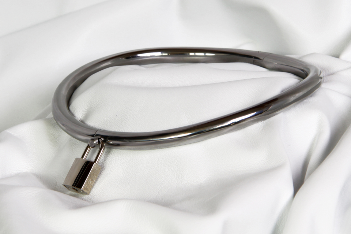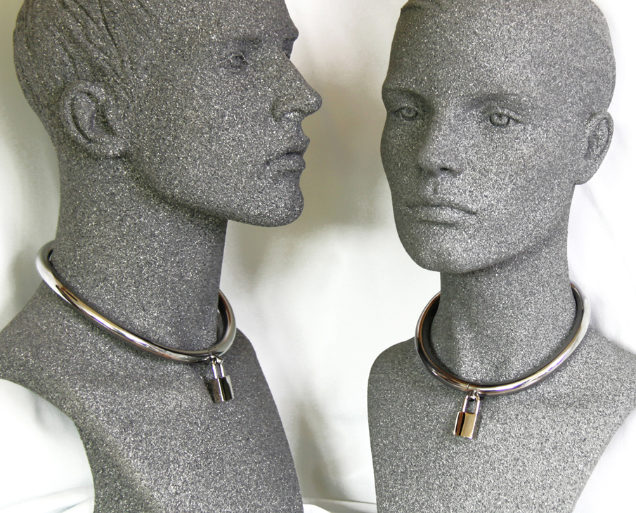 This stainless steel locking collar is made exclusively to our specifications and design and is available in various different sizes, offering an optimum fit. It is rounded and contoured to fit over the shoulders and because it is made from high grade Stainless steel it can be worn without a risk of allergies. It is ideal for collaring ceremonies as it can not be removed due to the locking pin mechanism, and yet it is delicate enough to be viewed as jewellery and worn 24/7. It comes supplied with a FREE small chrome plated padlock and is hinged at the back. The overlap at the front eliminates and unsightly gaps and prevents pinching of the skin. This collar is solid stainless steel and has a very highly polished finish and is 10mm / 3/8" in diameter. Please take time to measure the neck circumference of the wearer to ensure the best possible fit.