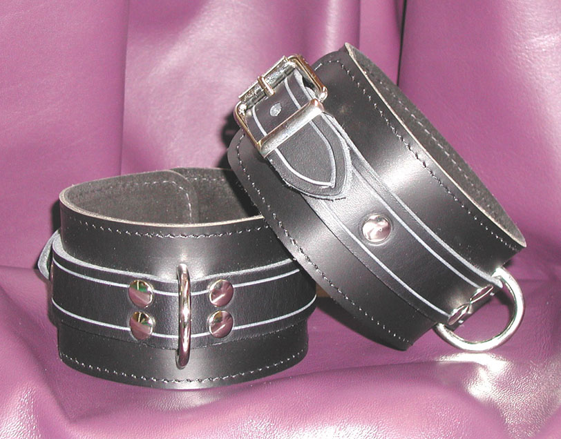 Made to order, these great entry level ankle cuffs are lined with soft black suede. The cuff is 2 1/4" / 55mm wide with a 1" / 25mm bridle leather strap using a solid cast Dee ring for attachment. Designed and made to match our leather wrist cuffs they make the perfect accompliment to all of our other entry level restraints. As with all our other restraints they are available with either a traditional or lockable buckle.