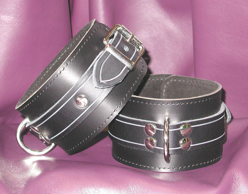 Made to order, these close fitting leather handcuffs are lined and stitched with comfortable soft black suede. The cuffs are 2 1/4" / 55mm wide with a strong 3.5mm thick bridle leather strap which is 1" / 25mm wide with a single D-ring for attachment. As with all of our other styles of wrist cuffs they are available with either a locking buckle or traditional buckle, with a large range of adjustment ensuring a good tight fit. We use only solid cast buckles and D-rings and each bondage cuff is double riveted for strength. This style of leather wrist cuffs compliment our leather ankle cuffs and leather bondage collar, or they can all be purchased together as a full leather bondage restraint set.