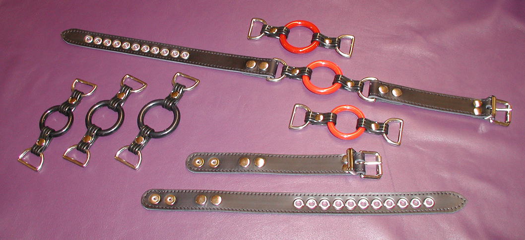 Beautifully finished ring gag trainer, supplied with 3 different sized rings and available in two different colours. The ring is made from extremely durable nylon with a 1"/25mm strap made from the fine leather, fully lined and stitched. The rings are inter-changeable with the use of quality press studs making this slave gag extremely versatile.