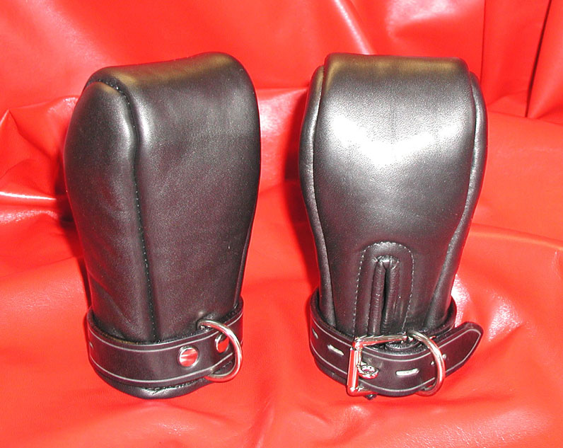 Made to order, these fist mitts are made using the softest of leathers and fully leather lined and padded with a 1 inch or 25mm buckle strap around the wrist for closure. They are close fitting and contoured, designed to fit a closed fist with a leather fillet behind the buckle closure preventing any hair or skin being trapped. Being padded these mitts offer both comfort with security. When these padded fist mitts are fitted they completely immobilise the wearers hands, preventing them from being used. They have two 1 inch / 25mm D-rings on each mitt for either attaching together or for securing down. These are our best selling leather mitts.