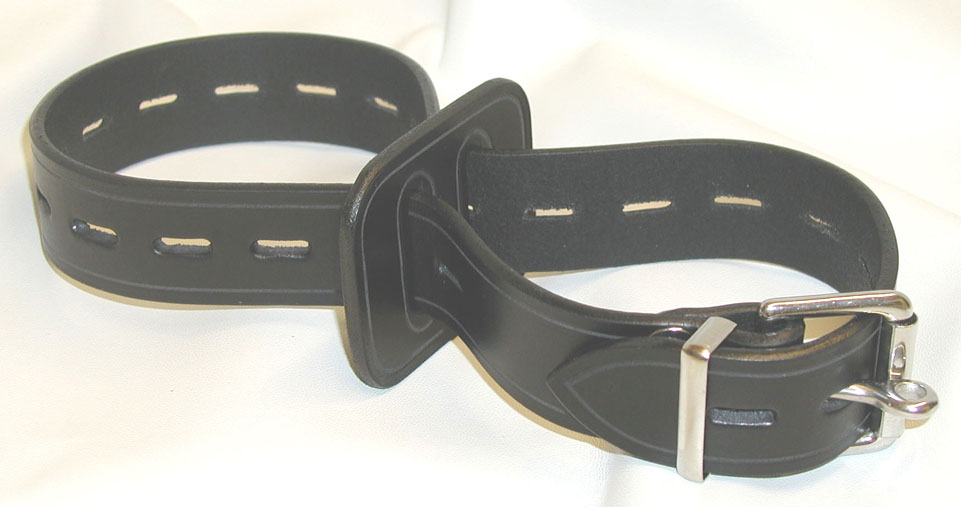 These extremely versatile 1 1/4" / 30mm wide leather bondage restraint are ideal for attaching limbs together or for attaching limbs to furniture. The sliding centre plate ensures a tight grip is kept at all times. A very inexpensive piece of bondage gear that works very effectively. Made from 3.5mm Italian bridle leather and beautifully finished with bevelled and dyed edges. 20" / 500mm total strap length and the centre plate size is 3" x 2" / 75mm x 50mm. Please note that this item is sold individually and available with locking or traditional buckle. Different sizes are available, please contact us for a quotation.