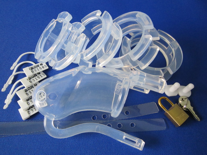 The BON4L is an great male chastity device made from clear silicone, making it flexible, comfortable and warm to wear. Each device comes with 4 different sized silicone rings measuring 40mm, 44mm, 48mm and 52mm. With the use of lubricant simply place your genitals through your chosen ring size then attach the penis cage, locking on with either the supplied brass padlock or one of the numbered plastic locks that come with your new toy. The BON4L has a medium / large sized cage with a total length of 110mm. There are 3 holes in each cage, for ease of cleaning and urinating, but the holes are not large enough to allow the wearer to play. Please be assured that these are the original and genuine BON4L and not cheaply made imitations, so you can buy with confidence.