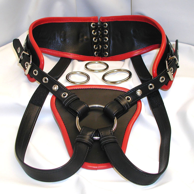 Our strap on dildo harness is beautifully made and is the ultimate in style and luxury. With the belt placed into the small of the back this strap on harness is both extremely comfortable and strong enough to withstand vigorous play. The front shield is lined with patent leather making it very easy to keep clean, and the Velcro under straps have two fixing points giving plenty of adjustment and allowing it to be tightened to the desired level of comfort. The waist belt has two way adjustment, both buckles at the front and lacing at the back to make positioning of the dildo accurate. Made with high quality soft leather with a choice of edging colour you can colour co-ordinate your dildo harness to compliment your other bondage gear. Supplied with 4 different ring sizes, which are easily changed, this dildo harness works with most flanged based dildos available. Although this dildo harness is highly adjustable please supply a waist circumference and under strap length to ensure the best fit. (Dildo sold separately)