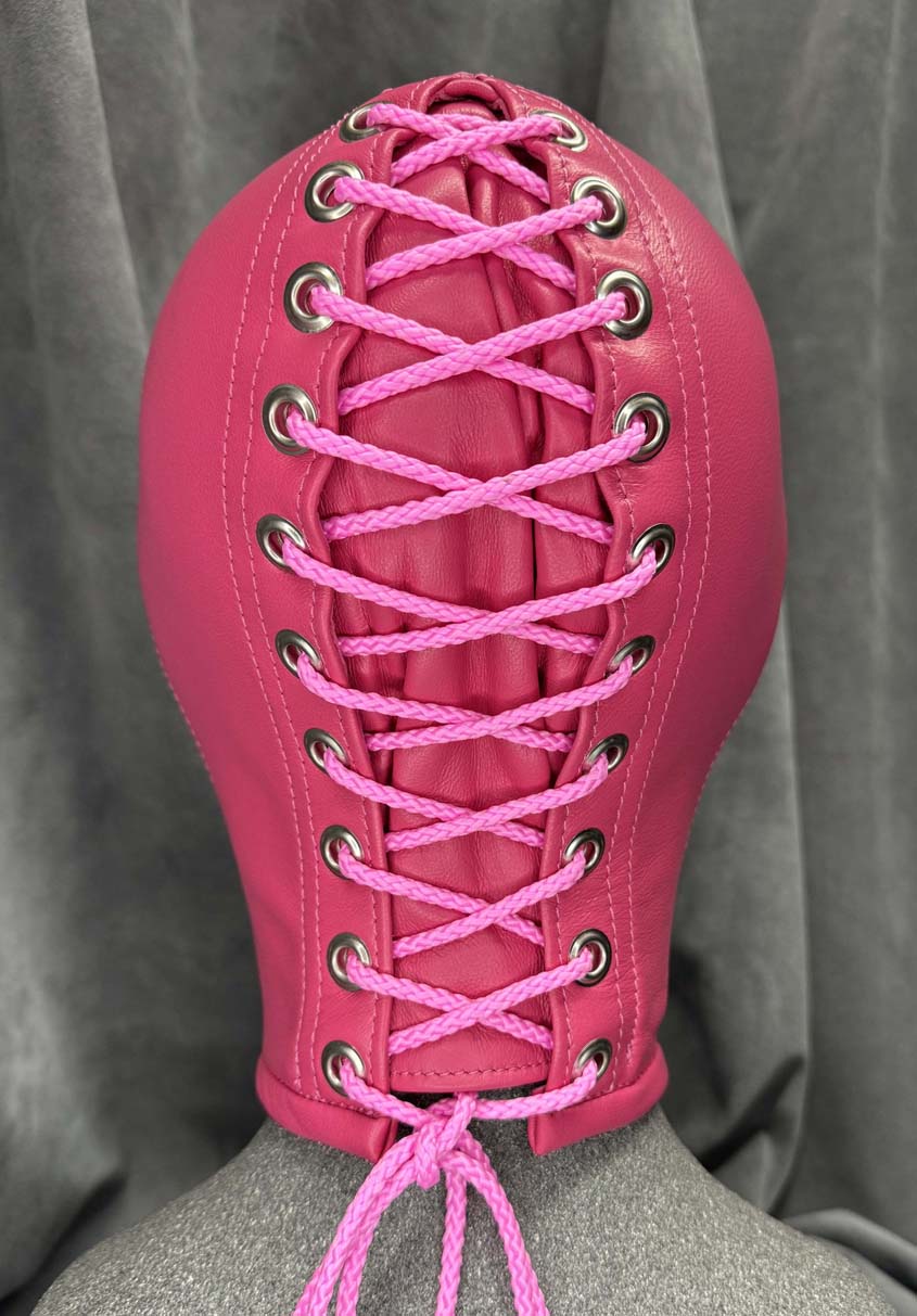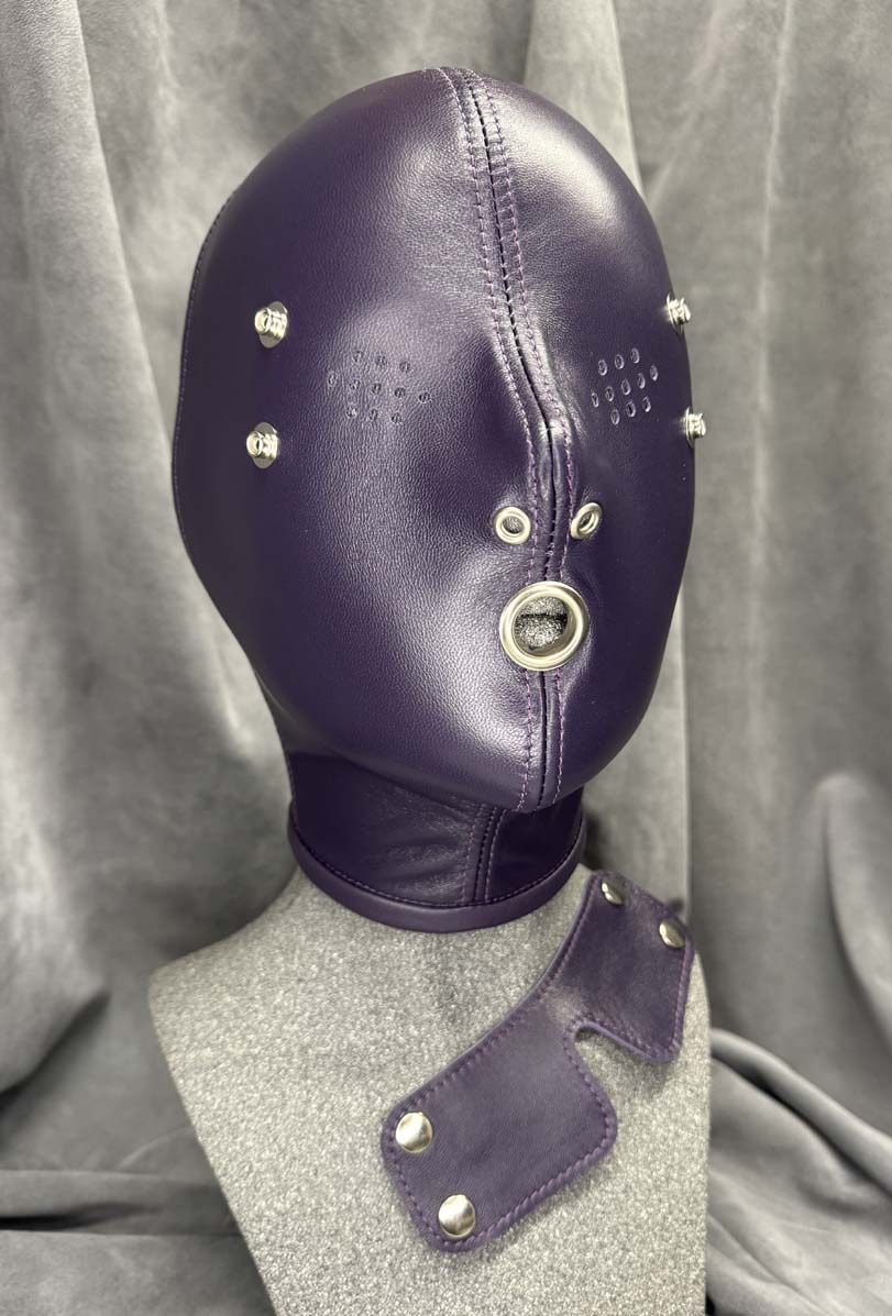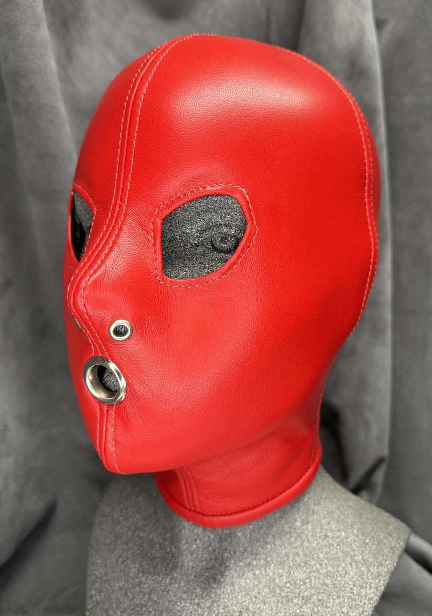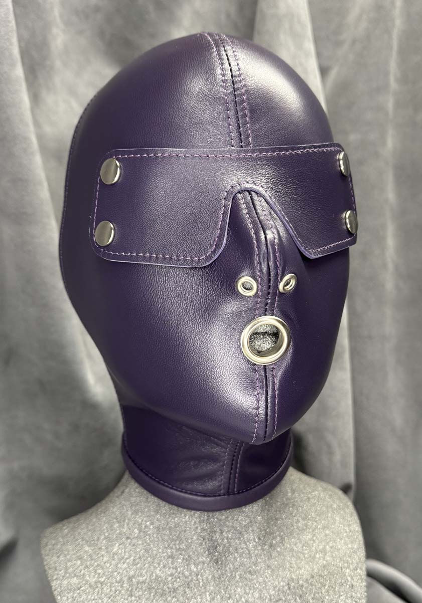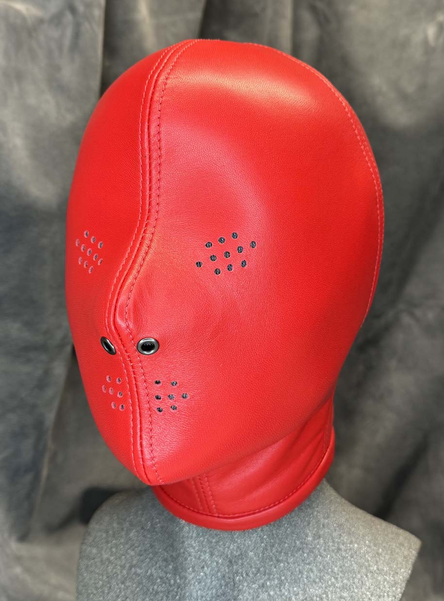 Made to order, our classic slave hood is made from a single skin of the best quality gloving leather making it buttersoft to the touch and have enough elasticity for a beautiful snug fit. All seams are reinforced with the same soft leather for strength and there is a hair protector in the back to prevent hair being trapped in the laces. This classic slave hood is super lightweight making it easy to wear for many hours. There are many ways you can design this hood to your tastes, you have the choice of 5 colours, all of the metalwork can be in either silver or black which includes lacing eyelets, nose grommets, blindfold press studs and mouth grommet (1/2” / 12 1/2mm internal diameter), and you have 3 eye options along with optional blindfold. You also have the choice of a completely open chin giving you the maximum opening for gags or oral duties and an optional slot at the back to allow your own hair to be put through as a ponytail. The nose grommets come as standard in the colour of your choice, you can also have an optional extra which is a pair of nose grommet plugs. These fit into the nose grommets from the outside, they are ideal for reducing the airway and they minimise any light getting into the hood. They are easily fitted when required however we do not recommend these if there is no mouth opening. The hood is only available in the colours shown.