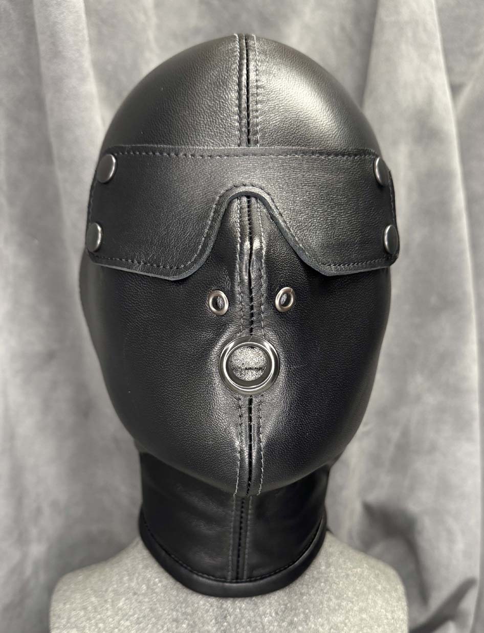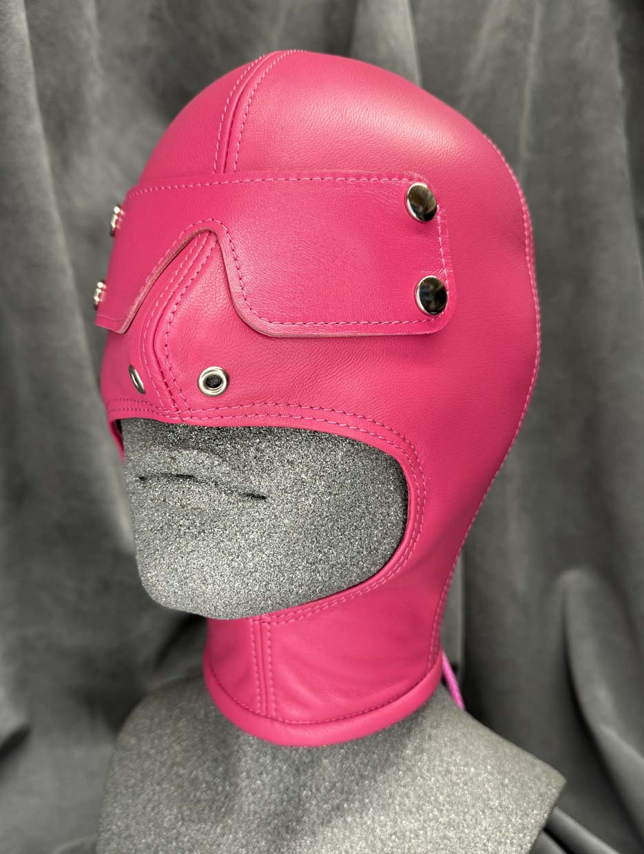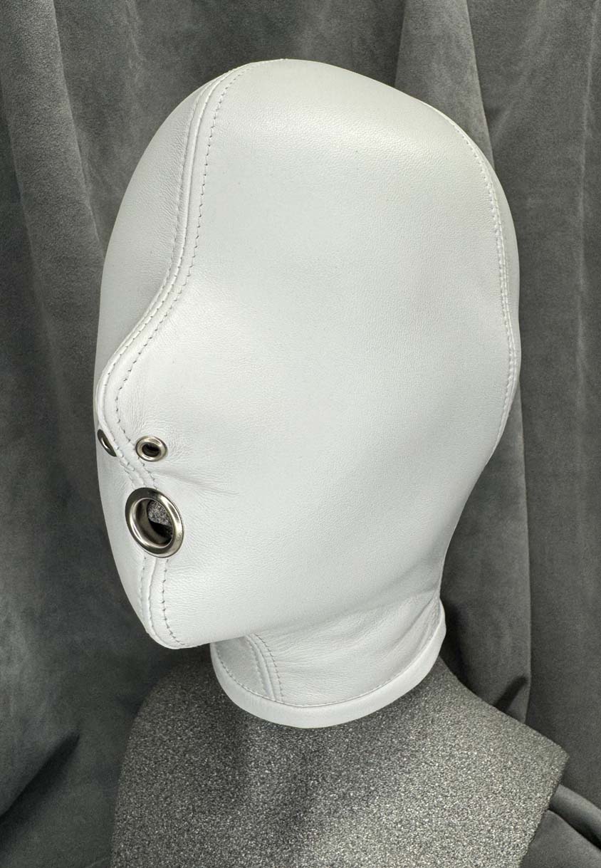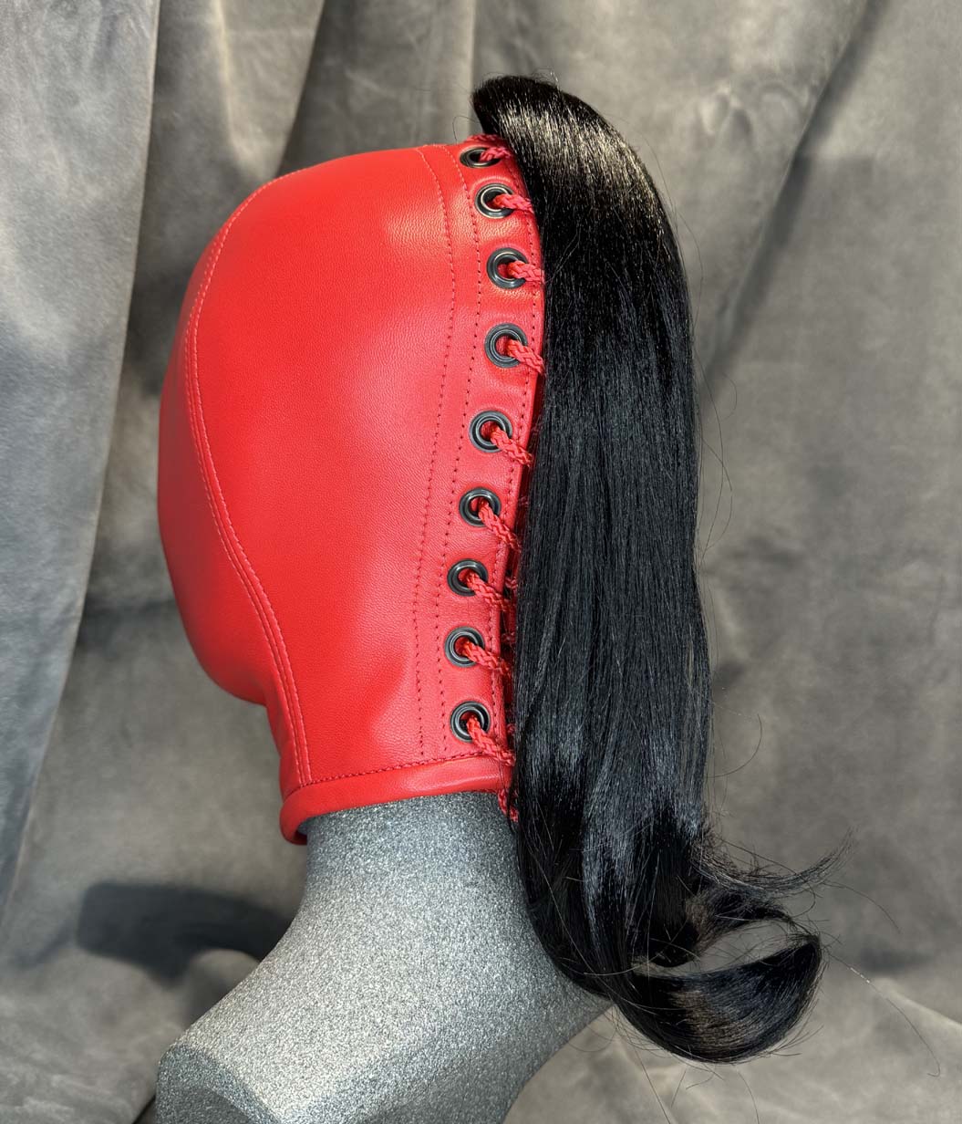Made to order, our classic slave hood is made from a single skin of the best quality gloving leather making it buttersoft to the touch and have enough elasticity for a beautiful snug fit. All seams are reinforced with the same soft leather for strength and there is a hair protector in the back to prevent hair being trapped in the laces. This classic slave hood is super lightweight making it easy to wear for many hours. There are many ways you can design this hood to your tastes, you have the choice of 5 colours, all of the metalwork can be in either silver or black which includes lacing eyelets, nose grommets, blindfold press studs and mouth grommet (1/2” / 12 1/2mm internal diameter), and you have 3 eye options along with optional blindfold. You also have the choice of a completely open chin giving you the maximum opening for gags or oral duties and an optional slot at the back to allow your own hair to be put through as a ponytail. The nose grommets come as standard in the colour of your choice, you can also have an optional extra which is a pair of nose grommet plugs. These fit into the nose grommets from the outside, they are ideal for reducing the airway and they minimise any light getting into the hood. They are easily fitted when required however we do not recommend these if there is no mouth opening. The hood is only available in the colours shown.