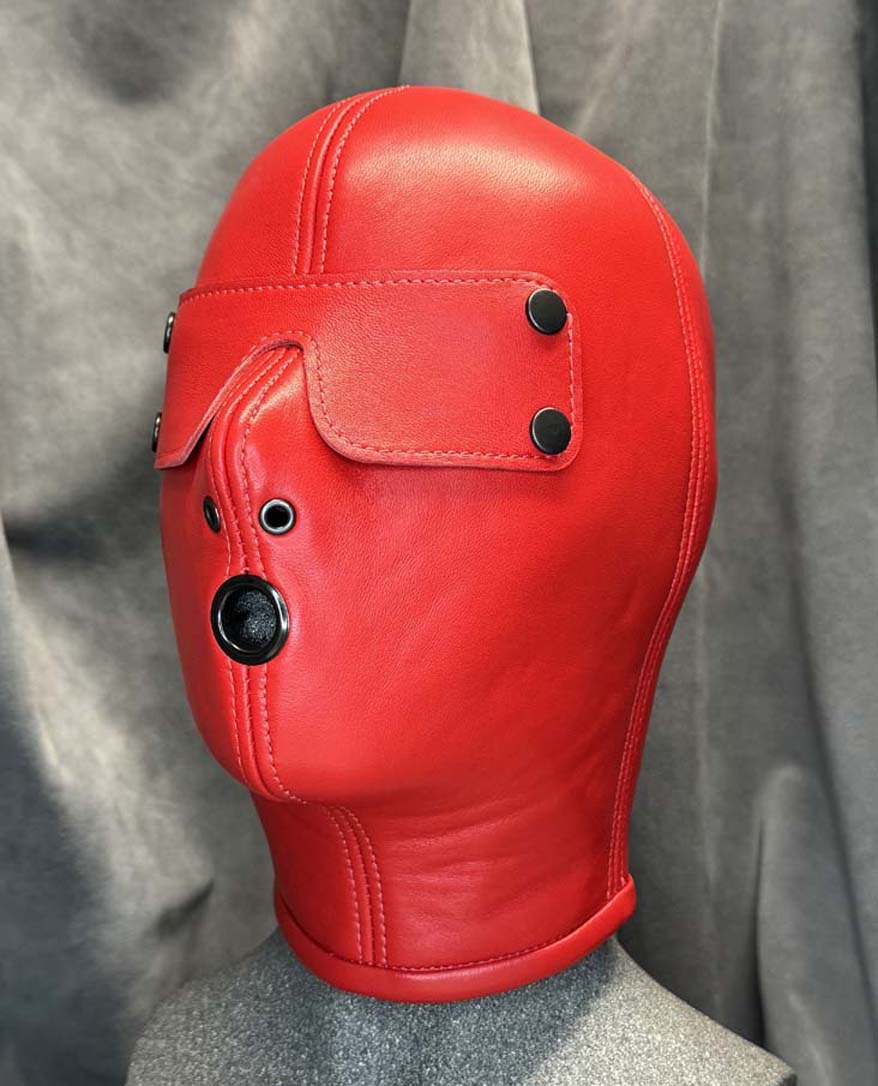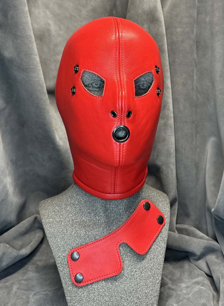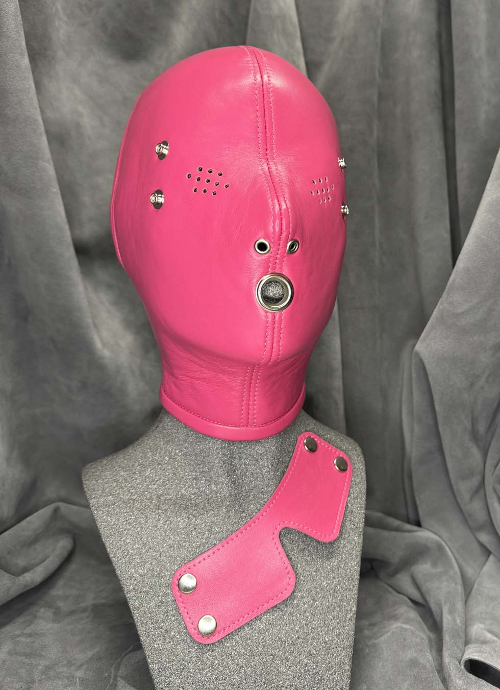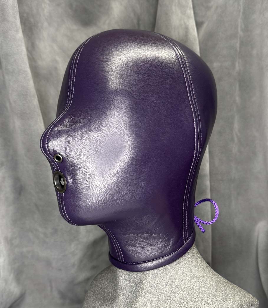 Made to order, our hood is anatomically designed with a very delicate padding using the best quality buttersoft gloving leather. It is smooth and supersoft both inside and out with all seams reinforced for strength. The padding particularly gives the feeling of being enveloped, ultimately giving a greater head trip. There are many ways you can customise the hood to your own personal requirements, you have the choice of 5 colours, all of the metalwork can be in either silver or black which includes lacing eyelets, nose grommets, blindfold press studs and mouth grommet (1/2” / 12 1/2mm internal diameter), and you have 3 mouth choices and 3 eye choices along with optional blindfold. If you wish to have your hair in a ponytail then there is also the option to have a slot in the back to allow for this. The nose grommets come as standard in the colour of your choice. You also have an optional extra which is a pair of nose grommet plugs. These fit into the nose grommets from the outside, they are ideal for reducing the airway and they minimise any light getting into the hood. They are easily fitted when required however we do not recommend these if there is no mouth opening. This hood is unique to us and exceptionally comfortable. You design it and we will build it just for you! Only available in the colours shown.
