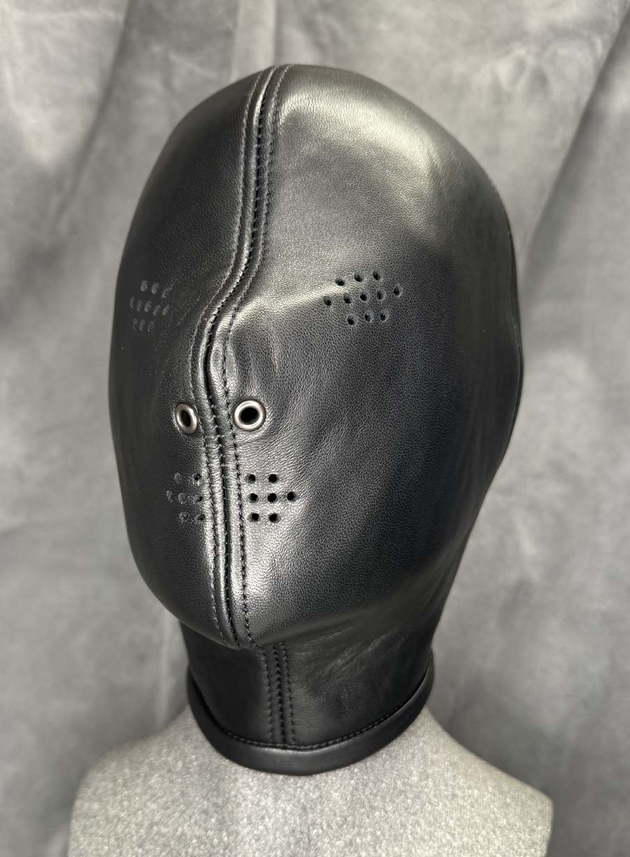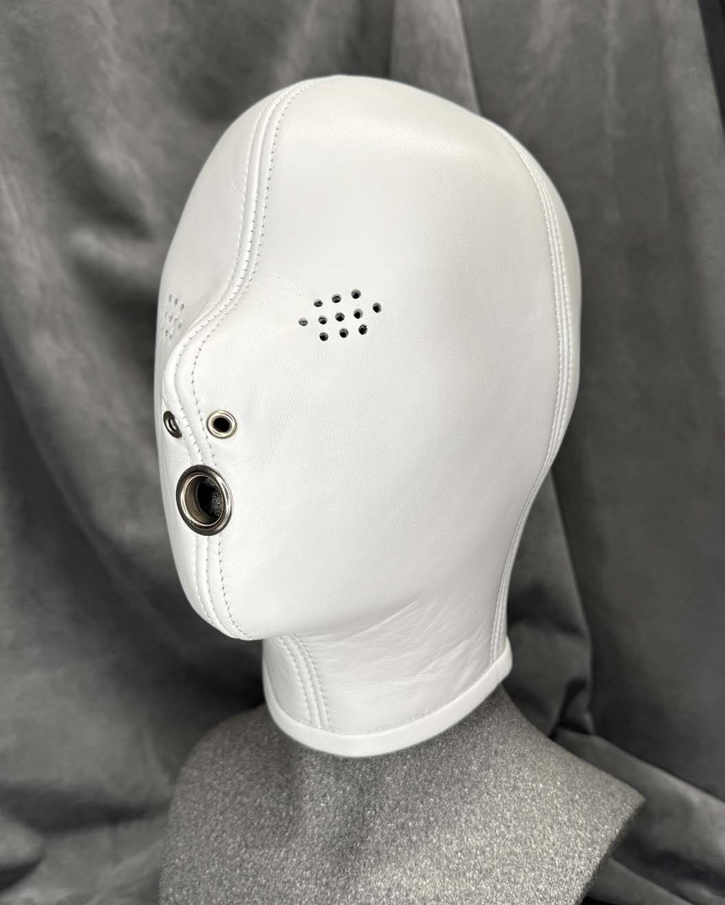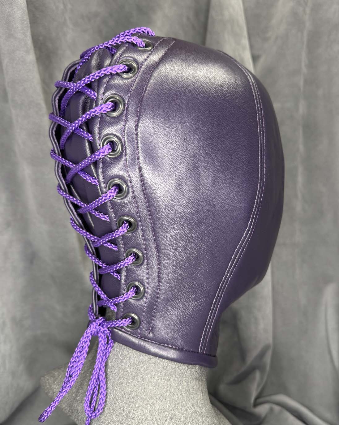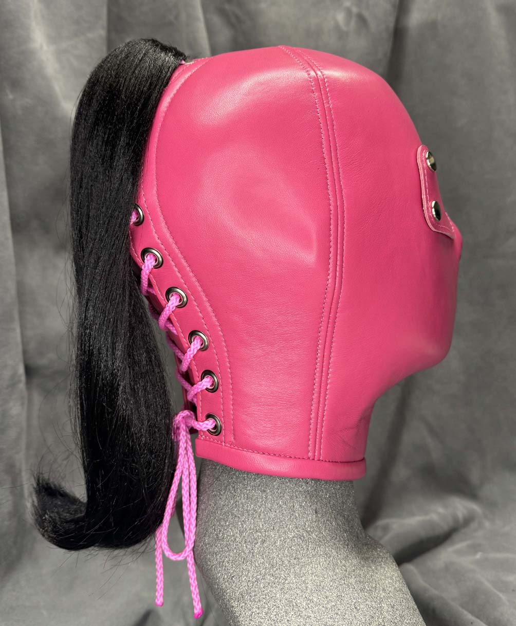 Made to order, our hood is anatomically designed with a very delicate padding using the best quality buttersoft gloving leather. It is smooth and supersoft both inside and out with all seams reinforced for strength. The padding particularly gives the feeling of being enveloped, ultimately giving a greater head trip. There are many ways you can customise the hood to your own personal requirements, you have the choice of 5 colours, all of the metalwork can be in either silver or black which includes lacing eyelets, nose grommets, blindfold press studs and mouth grommet (1/2” / 12 1/2mm internal diameter), and you have 3 mouth choices and 3 eye choices along with optional blindfold. If you wish to have your hair in a ponytail then there is also the option to have a slot in the back to allow for this. The nose grommets come as standard in the colour of your choice. You also have an optional extra which is a pair of nose grommet plugs. These fit into the nose grommets from the outside, they are ideal for reducing the airway and they minimise any light getting into the hood. They are easily fitted when required however we do not recommend these if there is no mouth opening. This hood is unique to us and exceptionally comfortable. You design it and we will build it just for you! Only available in the colours shown.