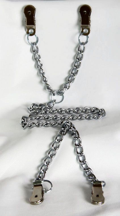 Have fun with these simultaneous nipple to labia clamps that will control the wearer to great effect. They have a connecting chain with a pair of easy to attach clamps at both ends. They are made for the ladies, but would work just as well on men, attaching his nipples to his scrotum.